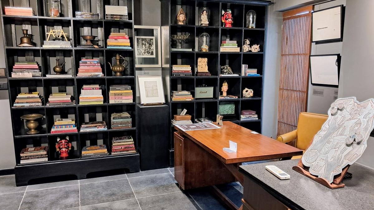 The lighting is intentional: track lighting highlights the art, while the rest of the room is warmed by light filtering through the vertical wooden panels behind the desk — “like the shuttered or louvered effect seen in many old Madras (Chennai) homes,” explains Johal. He adds that covering the windows opposite the door with black fabric controls the light, and using the wooden panelling over it creates a nice display area, offering a departure from the grey boards.