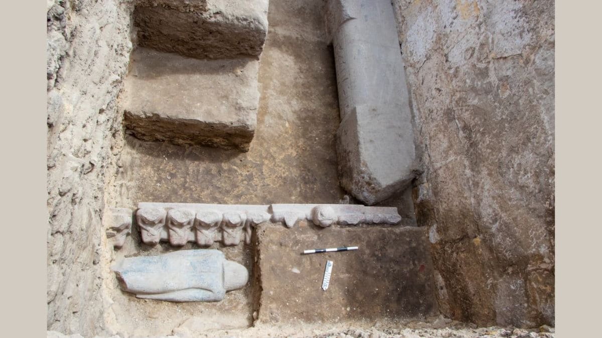 Within the tomb, scholars discovered artifacts dating to the early Fifth Dynasty. Thirteen stone stools were found, each of which once held a pink granite statue thought to represent Userefre’s wives, though two of the statues lacked heads. A secondary pink granite doorway featuring the cartouche of King Neferirkare, Userkaf’s successor, and a black granite statue, which had been knocked over among the ruins, were discovered.