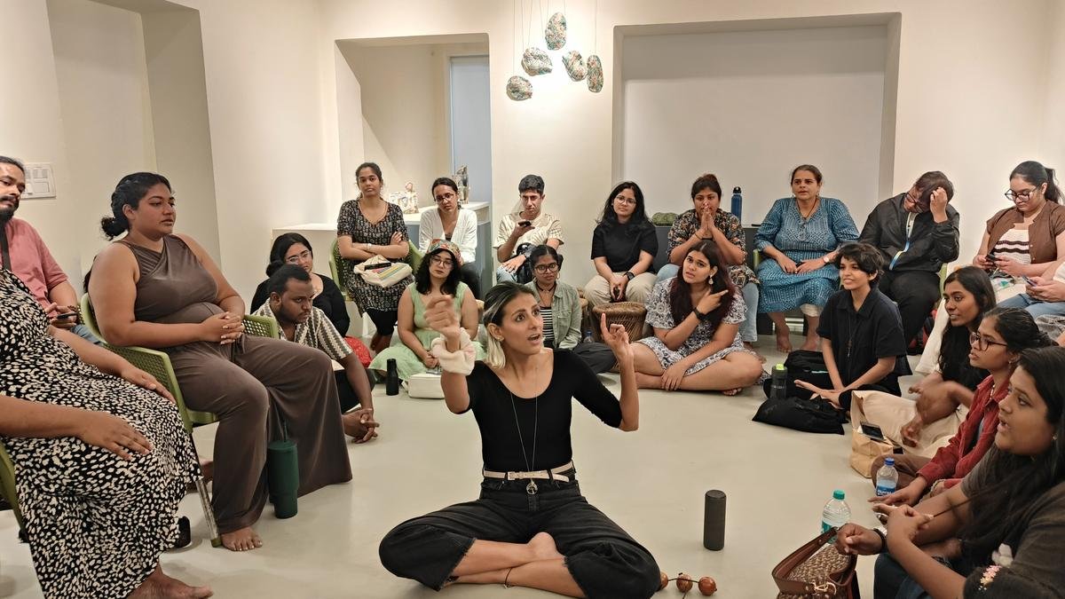 There is a slow but sure lowering of inhibitions here after the first hour. People are getting to know their neighbours (Medha strictly forbids people from sitting next to people they already know), and there is palpable excitement when we get our song for the day — ‘Pink Pony Club’ by Chappell Roan. After a few chaotic minutes of figuring out whether we are high, low, or medium on the pitch scale, we are divided into groups to learn the song.