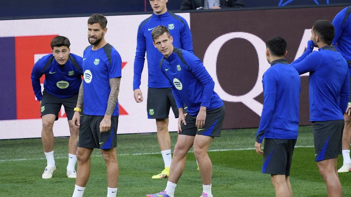 Barcelona’s Dani Olmo, center, exercises with his team during a training session in the Dortmund stadium ahead of the Champions League quarterfinal second leg soccer match between Borussia Dortmund and FC Barcelona, in Dortmund, Germany, on April 14, 2025.