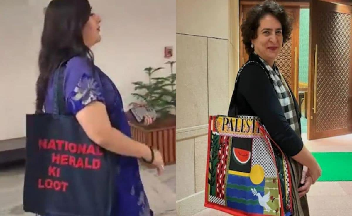 In a tote-for-tat move, BJP MP Bansuri Swaraj reached the Parliament Annexe building today to attend a Joint Parliamentary Committee meeting on ‘One Nation One Election’ with a tote bag that had ‘National Herald Ki Loot’ written on it. The bag statement, clearly aimed at the Gandhi family and the Congress, is also a swipe at Congress leader Priyanka Gandhi Vadra, known to send a message with her bags.