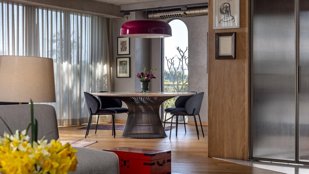 The piano nook is adorned with a striking red monkey sculpture by designer Arun Kumar, which, along with the Binic lamp by Lonna Vautrin, contrasts sharply with the glossy black piano, making this corner stand out. The house has a British-style, glass box conservatory on its terrace, which serves as a recreational area. Thermally insulated ash timber flooring is set in a herringbone pattern, creating a smooth transition of the home’s material palette into the conservatory. The lower level of the residence showcases a blend of contemporary and vintage furniture, while the upper level features an eclectic selection of repurposed and reupholstered pieces.