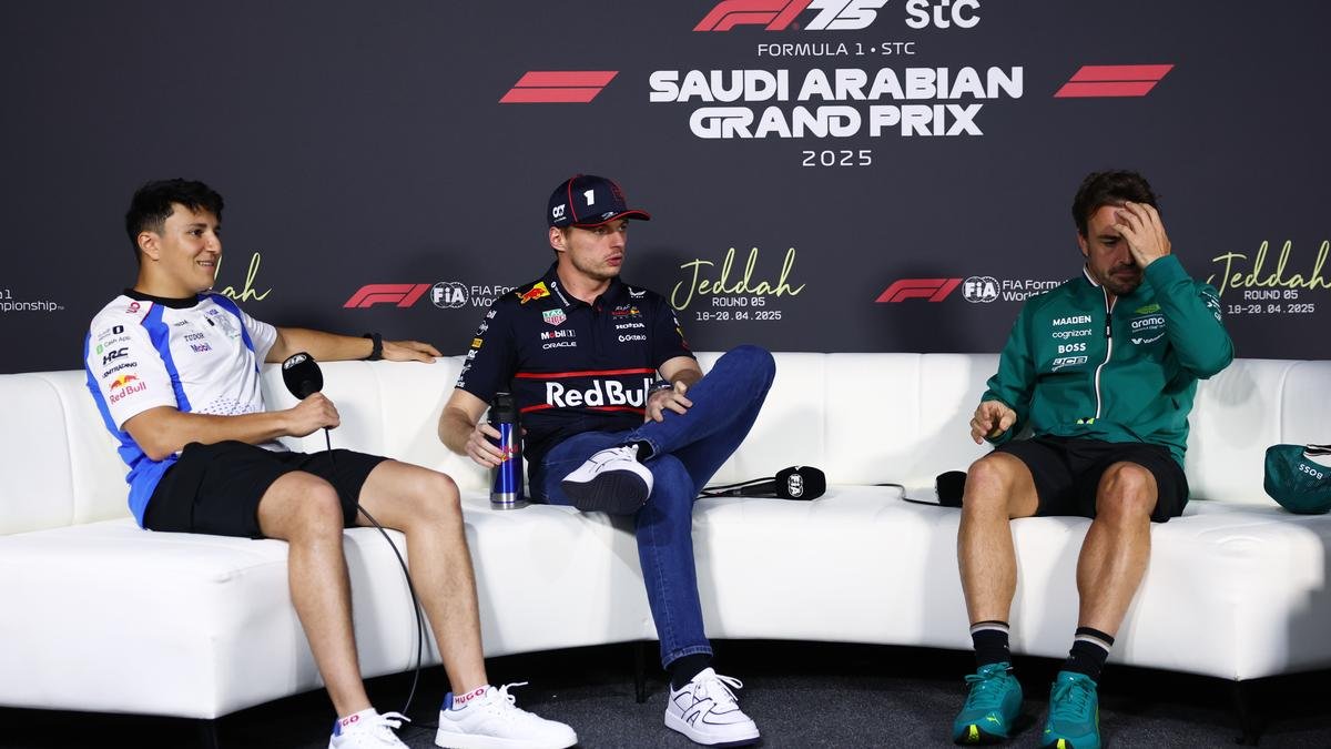 Isack Hadjar of France and Visa Cash App Racing Bulls, Max Verstappen of the Netherlands and Oracle Red Bull Racing, and Fernando Alonso of Spain and Aston Martin F1 Team look on during the Drivers Press Conference during previews ahead of the F1 Grand Prix of Saudi Arabia at Jeddah Corniche Circuit on April 17, 2025 in Jeddah, Saudi Arabia.