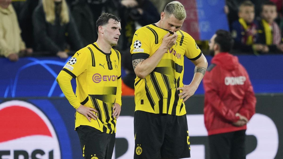 Dortmund’s Niklas Suele, right, and Dortmund’s Pascal Gross react at the end of the Champions League quarterfinals second leg.