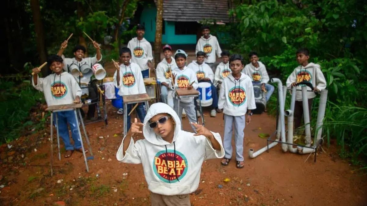 A motely crew of children are jamming, drumming away on their improvised instruments while one of them vocalises a popular 90s hit number ‘Azhakiya Laila’. Meet Dabba Beat, a children’s band from Thrissur, which makes music out of scrap buckets, pots, wooden slabs, sticks, plastic water bottles and other everyday objects.