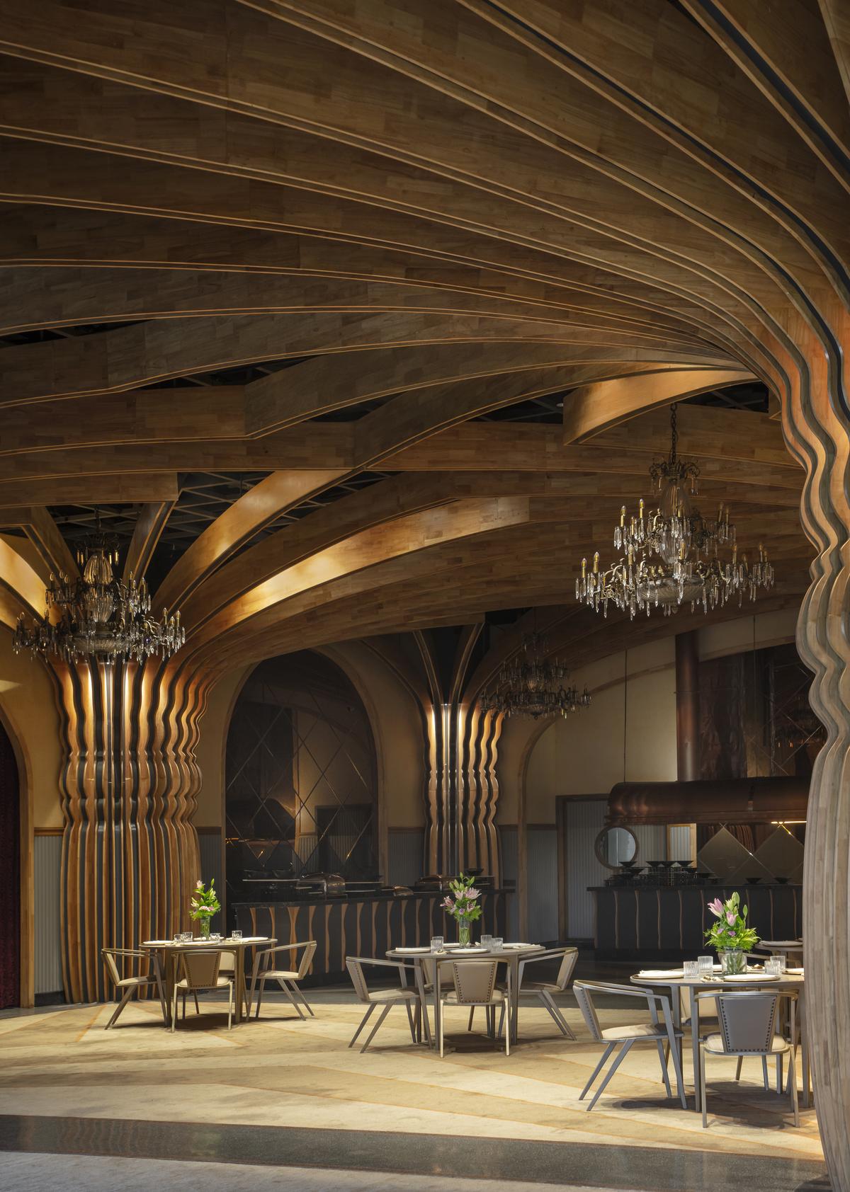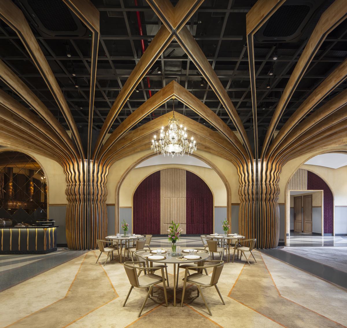 The terrazzo flooring mirrors the geometry and rhythm of the ceilings above, creating a continuous dialogue between horizontal and vertical planes. Together, ceilings, columns, chandeliers, and patterned flooring shape a cohesive spatial experience that balances monumentality with warmth,” adds Aurora. The material palette in this 6,568 sq.ft. space combines traditional references with contemporary fabrication techniques. Rubberwood boards have been used extensively to form the profiles of the cross-vaulted ceilings and columns, allowing for detailed articulation and continuity across the space. These elements are produced using CNC machining for precision, followed by hand-finished detailing to retain a crafted quality.