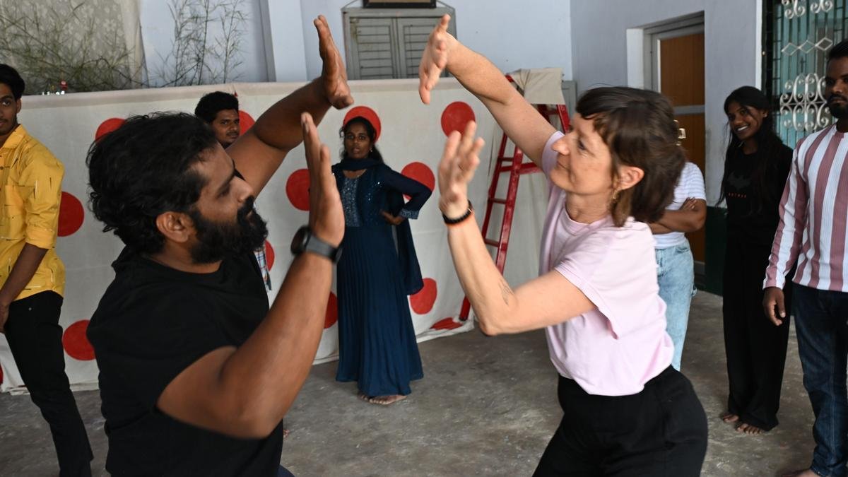 Manuela Runge, a Zurich-based theatre and dance artist, conducting a workshop for amateur actors in Tiruchi.