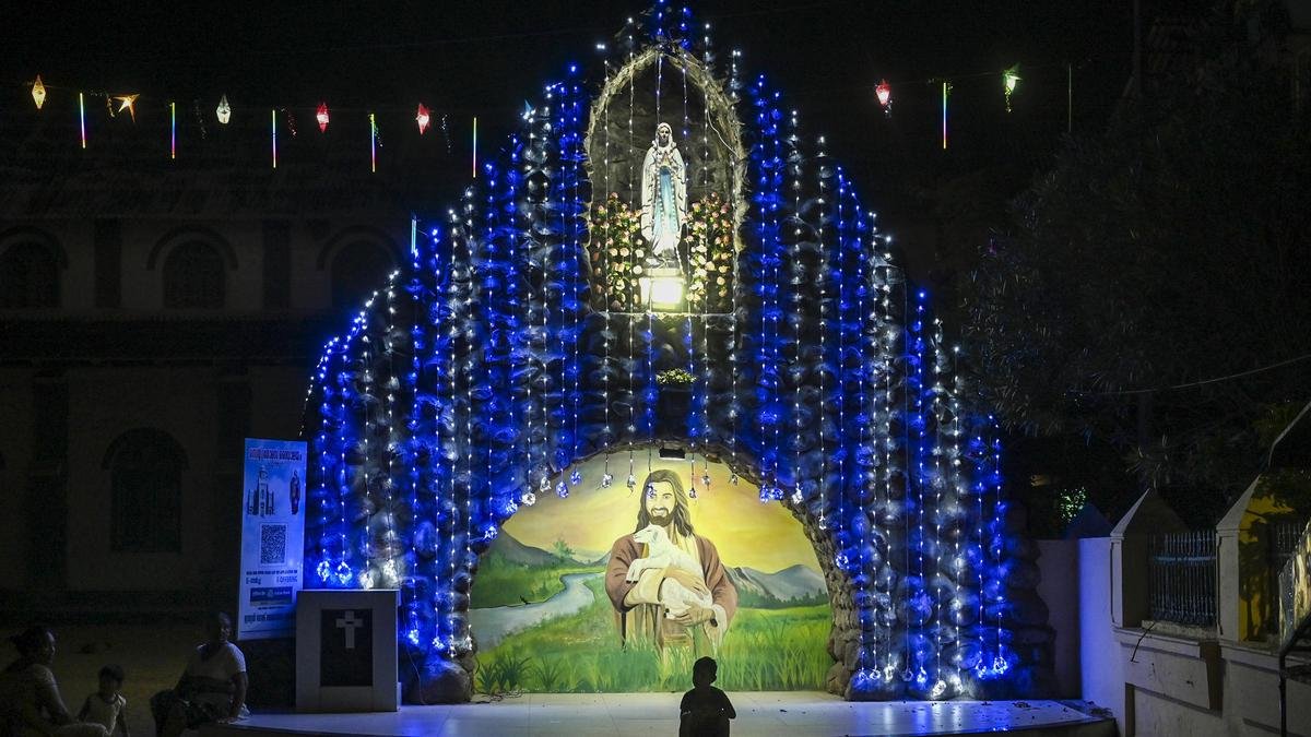An illuminated view of St Thomas Latin Catholic Church, Poonthura, ahead of Christmas celebrations