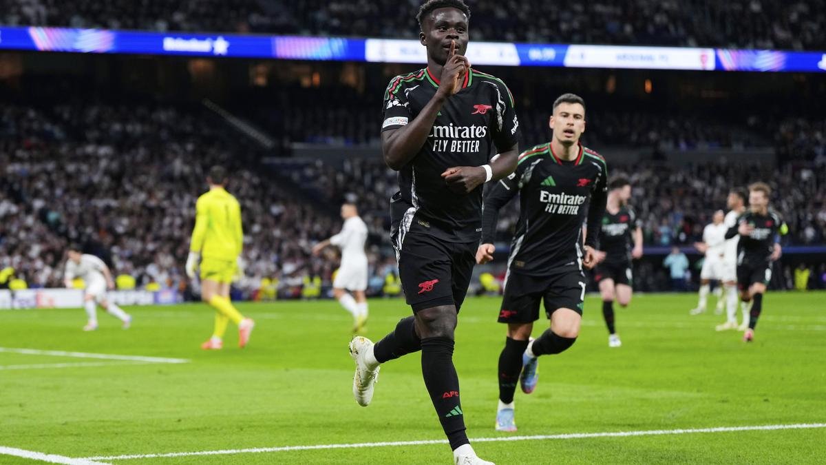 Arsenal’s Bukayo Saka celebrates after scoring the opening goal during the Champions League quarterfinals second leg soccer match between Real Madrid and Arsenal at the Santiago Bernabeu stadium in Madrid, Wednesday, April 16, 2025.
