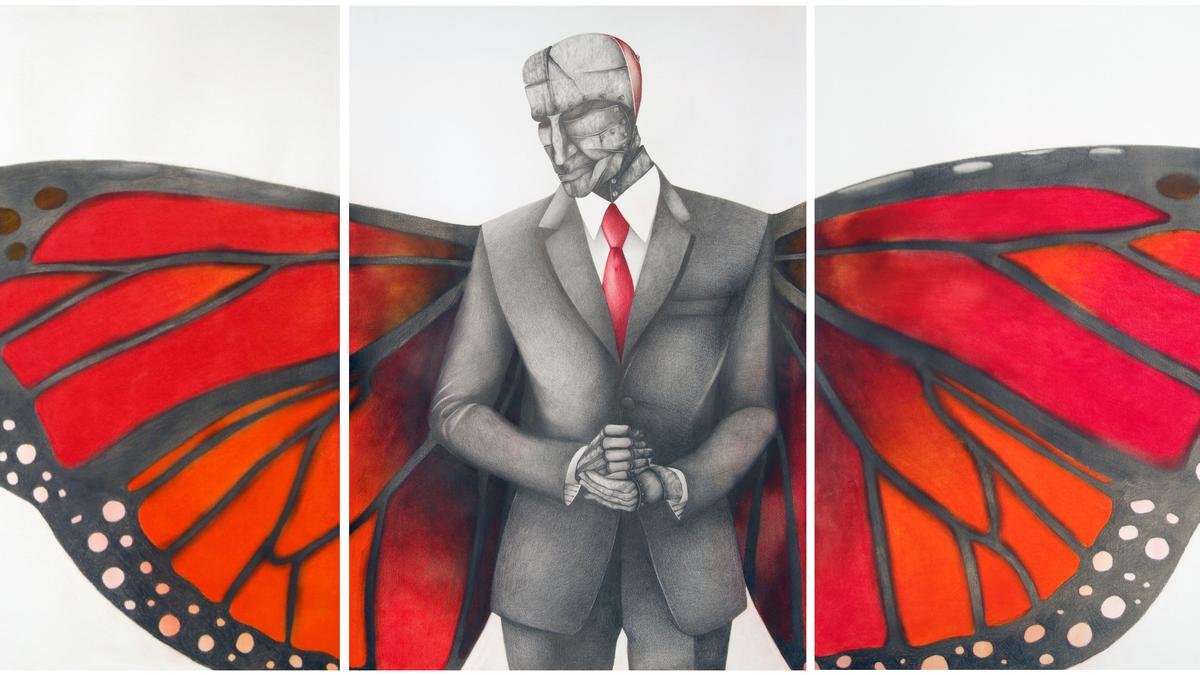 Through paper, wood, stainless steel, fibreglass and larger-than-life canvasses, Metamorphosis explores how we handle inner shifts in a world that’s always changing. It’s like a picture diary showing perseverance, self-reflection, and personal growth.