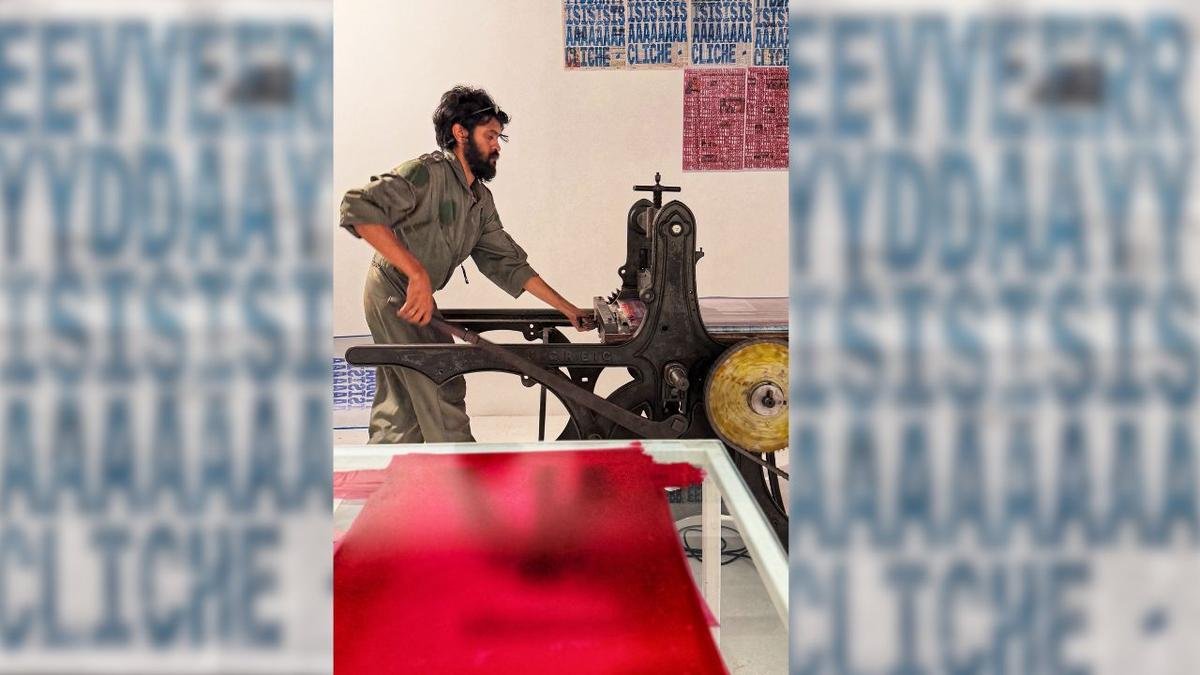 Artist Jayasimha Chandrashekar printing the phrase Every day is a cliché on the day’s newspaper on a litho press.