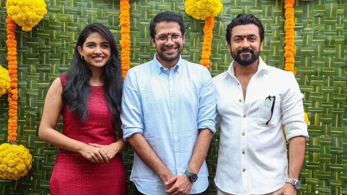 Mamitha Baiju, Venky Atluri and Suriya at the launch of ‘Suriya 46’.