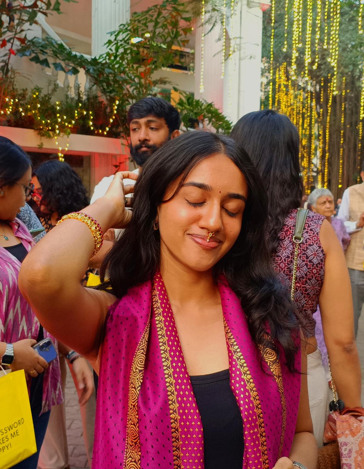 Janaki Sampath, an attendee at the fest, wore her grandmother’s rani pink dupatta made of Chanderi to add a pop of colour to her all black outfit. “When I was very sick, my grandmother wrapped a shawl around me to keep me warm. I remember being surprised that she chose something so beautiful for such a simple act of care. I can’t help but wonder how many quiet treasures she has tucked away” said Janaki. Along with that, she wore traditional dance jewellery, golden and rani pink bangles from Narayana Pearls and a septum ring to match from Sukra Jewellery.