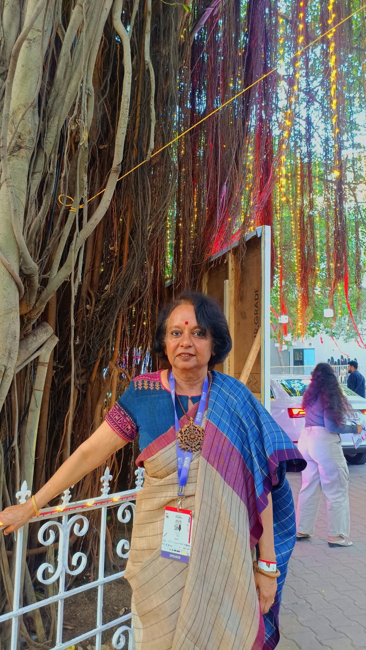 Sreemathi Ramnath, a polyglot consultant and writer who moderated a session at the fest wore a traditional saree in beige, purple and blue, sourced from an exhibition by the Crafts Council of India nearly 10 years ago. Her jewellery is from local artisans. However the true star of her outfit was her blouse made by the Sapa tribe, indigenous to northern Vietnam. “The print stood out to me. It was originally a jacket which I converted into a blouse,” said Sreemathi.